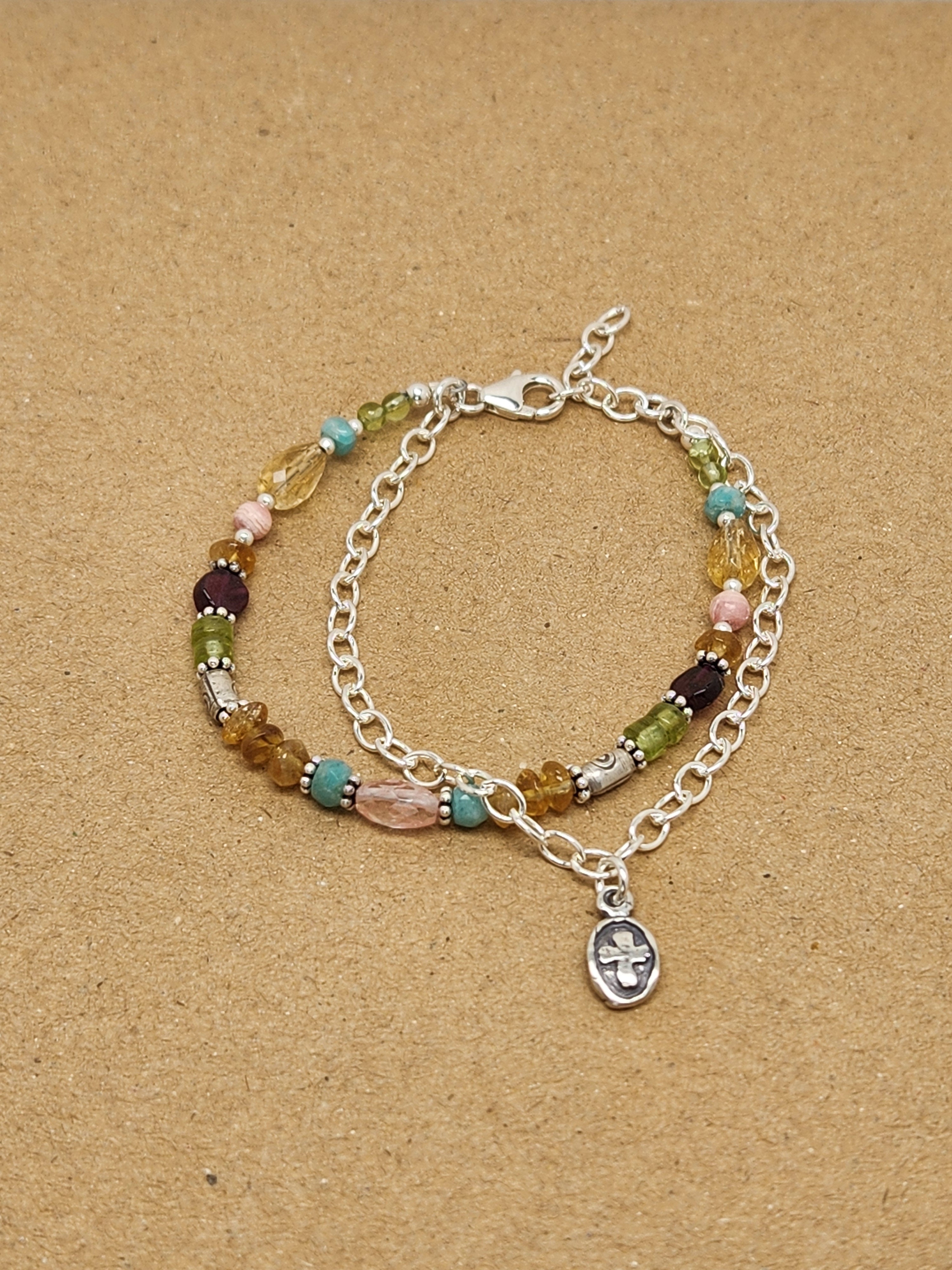 Elegant and meaningful, this double-strand bracelet is hand-strung with a vibrant mix of amber, amazonite, garnet, peridot, and rose quartz gemstones. The bracelet doubles with a sterling silver link chain that gracefully holds our Kindness charm inspired by Proverbs 3:3, serving as a gentle reminder to carry kindness and faith each day. Lightweight yet eye-catching, this piece is perfect for layering or wearing on its own, making it both a beautiful and meaningful addition to any jewelry collection.