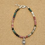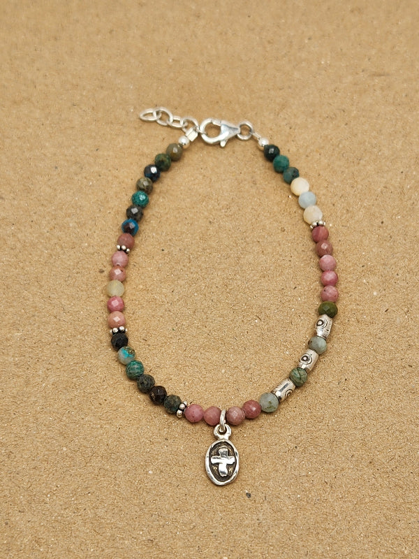 Delicate yet full of character, this handcrafted bracelet blends soft colors with thoughtful, meaningful design. Faceted natural gemstones in earthy greens, gentle blush pinks, and creamy neutrals form a harmonious, organic palette that feels both calming and elegant. The variety of stones adds subtle texture and sparkle, while tiny sterling silver accent beads provide a refined, luminous touch.