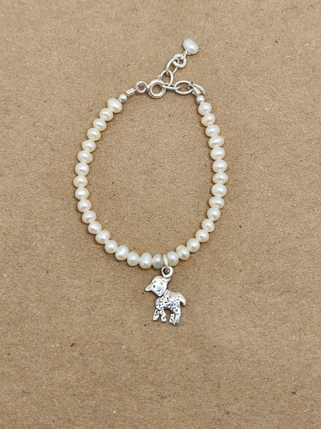 The cutest little lamb charm, hand-strung on freshwater pearls—an adorable way to wear a reminder of the Great Shepherd who watches over His little lambs.