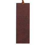 Brown topstitching borders the edges of this bookmark, and a light brown ribbon is tied at the top. The back of the bookmark is heat-debossed with a supporting verse from Exodus.