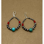 Embrace timeless Southwestern elegance with these stunning hoop earrings, meticulously handcrafted with authentic Navajo pearls, vibrant turquoise, and rich coral beads. Each hoop features a harmonious blend of textures and colors—shimmering sterling silver pearls, sky-blue turquoise stones, and warm red coral accents—woven together in a classic circular silhouette. Lightweight yet eye-catching, these earrings celebrate Native American artistry and the natural beauty of the desert landscape. Perfect for both everyday wear and special occasions.