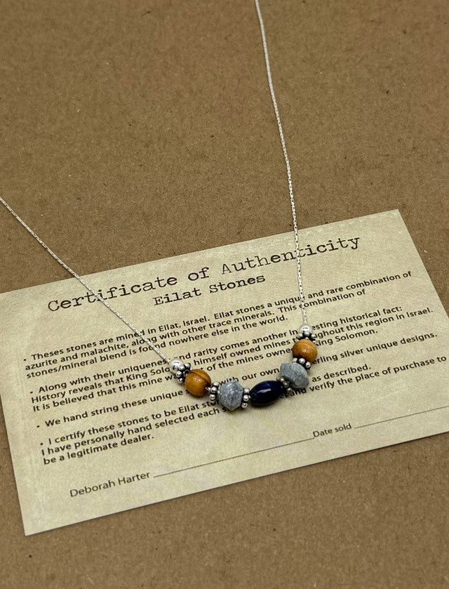 I, Deborah Harter, certify these stones to be Eilat stones, from Eilat, Israel as described. I have personally hand selected each stone in Israel and verify the place of purchase to be a legitimate dealer and the original mine source. After returning from Israel with these unique stones I designed this necklace so that you could enjoy wearing and sharing in the uniqueness of such historical stones.