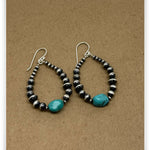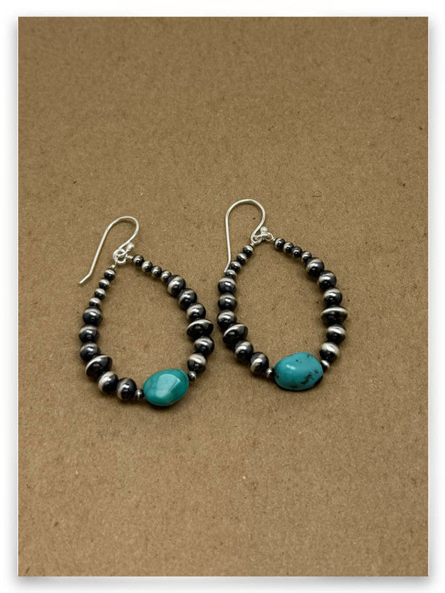 Celebrate timeless Southwestern beauty with these handcrafted Navajo Pearl and Turquoise Hoop Earrings. Each earring features a graceful hoop style adorned with smooth, oxidized sterling silver beads—known as Navajo pearls—for an antique finish and traditional elegance. Accented with genuine turquoise stones, these earrings bring a vibrant pop of natural color that reflects the rich cultural heritage of Native American artistry. Lightweight and full of movement, they're the perfect blend of rustic charm and modern style—ideal for everyday wear or special occasions.