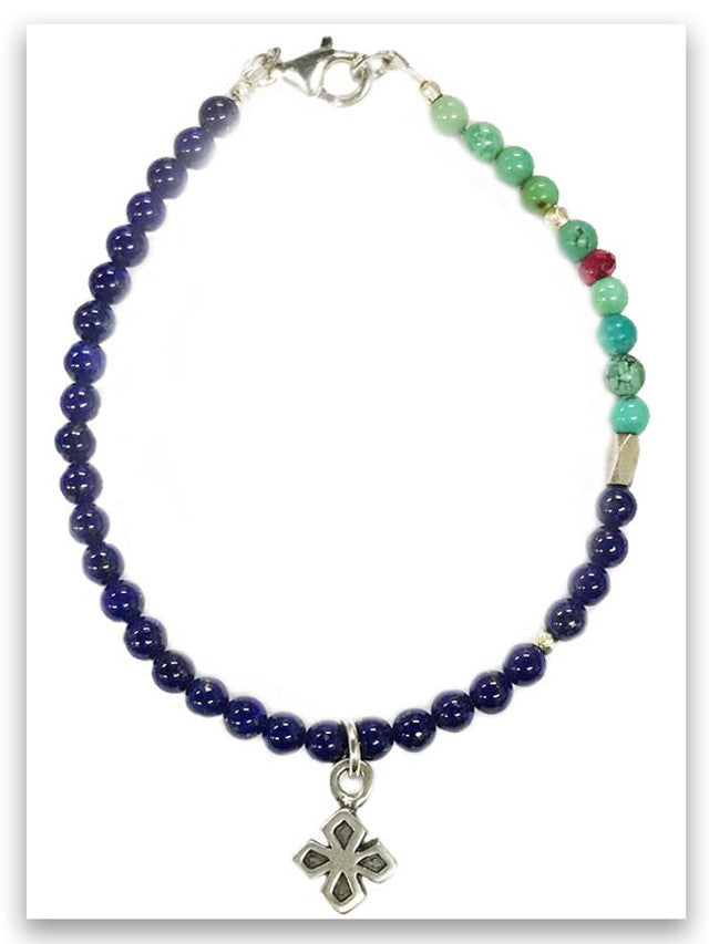 This hand-strung bracelet combines the rich royal blue of lapis with the bold, earthy tones of turquoise, creating a timeless and versatile color palette you’ll reach for again and again. A single ruby stone is added as a striking focal point—a subtle touch of depth and beauty.