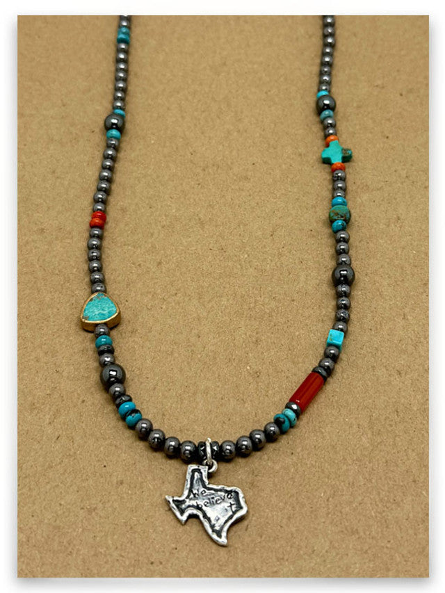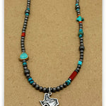 Show off your Lone Star pride with this stunning handcrafted Texas necklace! Featuring an eye-catching combination of pyrite, turquoise, and coral, this piece is more than just jewelry—it's a bold statement of Texan spirit and natural beauty. This necklace is perfect for those who love blending elegance with a rustic, Southwestern vibe.