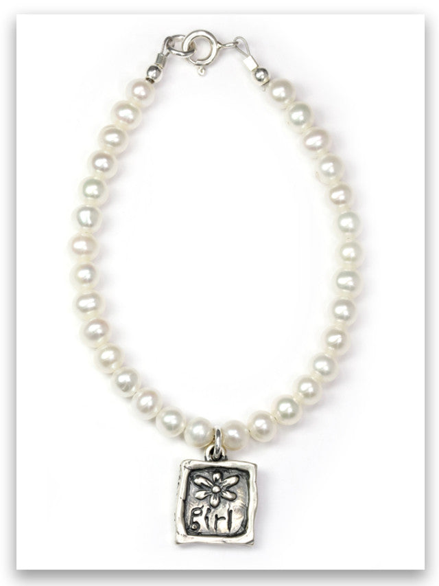 A sweet, hand-strung freshwater pearl bracelet featuring a charming flower girl charm—an elegant keepsake your little helper will treasure. A perfect touch to gift your flower girl on your big day, this bracelet is a beautiful reminder of her special role in your wedding.